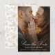 Make a sophisticated statement with this elegant photo save the date card. The design features your full-bleed vertical engagement photo on the front, layered with refined white calligraphy and classic serif text for your wedding details. The back showcases a luxurious gold and white chinoiserie floral pattern, adding warmth and timeless appeal to the overall presentation. Perfect for formal weddings and elegant weddings, this save the date sets the tone for a refined and memorable invitation suite.