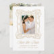 Announce your wedding with this elegant gold ornate frame photo save the date, designed with a hand-drawn antique picture frame that adds a refined, artistic touch. The front showcases the couple’s vertical engagement photo framed in gold, with “Save the Date” displayed in flowing calligraphy and the wedding details set in classic serif lettering. On the back, a horizontal photo is paired with space for custom text and a QR code, allowing guests to easily access your wedding website. This personalized photo save the date combines timeless style with a modern, streamlined way to share important wedding details.