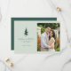 This wedding save-the-date card features a split layout with a light green background on the left, showcasing a beautifully detailed illustration of a coniferous tree. The right side displays a candid photograph placeholder of a couple in a garden setting, surrounded by vibrant red flowers and lush foliage. The design combines classic elegance with nature-inspired simplicity, using a soft color palette of greens, whites, and red accents. Elegant serif typography is used to convey essential details, creating a warm and celebratory mood perfect for announcing an upcoming marriage.