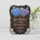 Romantique mariage rustique violet et bleu enregistrer les cartes de date avec dentelle fleurie blanche, lumières à cordes et coeurs floraux contre un arrière - plan en bois de grange. Éléments correspondants disponibles.