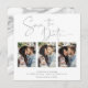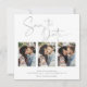 Écrit à la main Enregistrer la date Marbre Argent Carte photo multiple dans une police qui est élégant et évoque une sensation manuscrite romantique. Sur le dos, des veines à la mode argentée traversent le marbre classique. Conçu pour utiliser trois de vos photos préférées pour une personnalisation supplémentaire. Ajoutez facilement vos noms et dates pour un design vraiment personnalisé.