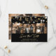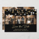 Elégante photo personnalisée en noir et or mariage enregistrer les cartes de date avec un titre de script moderne. Notre mariage, sauf la date, présente un montage photo de 3 images contre un arrière - plan noir orné de lampes à cordes sur le devant et d'une photo à l'arrière. Personnalisez facilement ce noir enregistrer la carte de date avec vos images et les détails du mariage.