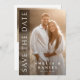 Mariage enregistrer la carte de date avec votre photo avec le texte blanc "Enregistrer la date" dans une police élégante alignée verticalement sur la gauche. Photo supplémentaire et message personnalisé au dos.