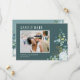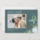 Ce mariage floral romantique et élégant Save The Date carte photo présente un design botanique chic qui comprend un bouquet élégant de feuilles d'eucalyptus aquarelle clairs et aérés, complété par des fleurs blanches et des feuilles dorés (imprimés) et est facilement personnalisable avec l'une de vos photos fiançailles préférées.