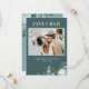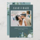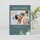 Ce mariage floral romantique et élégant Save The Date carte photo présente un design botanique chic qui comprend un bouquet élégant de feuilles d'eucalyptus aquarelle clairs et aérés, complété par des fleurs blanches et des feuilles dorés (imprimés) et est facilement personnalisable avec l'une de vos photos fiançailles préférées.