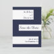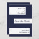 Ce mariage élégant bleu marine et blanc, sauf la carte de date, est parfait pour un mariage moderne. le design simple comprend élégante calligraphie bleue sur bandes blanches sur un arrière - plan bleu marine.