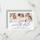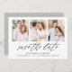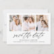Annoncez vos nouveautés dans le style avec notre Elegant Script photo enregistrer la carte de date. L'élégant enregistrer les cartes de date affiche 3 de vos photos fiançailles préférées encadrées en blanc avec "enregistrer la date" dans un script de calligraphie noir et moderne. Personnalisez la carte en ajoutant vos noms, votre date de mariage et votre emplacement de mariage. Le minimaliste enregistrer la carte date revient à un arrière - plan gris solide ou une couleur de votre choix.