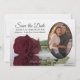 Ces belles cartes sont le moyen parfait de faire savoir à vos amis et à votre famille de sauver la date pour votre prochain mariage. Elles présentent un design romantique avec un seul rose bordeaux ou marron à long tige réfléchissant dans un bassin d'eau avec des vagues et des ondulations avec votre photo dans un cadre ovale. La légende indique Enregistrer la date avec de l'espace pour vos noms, la date et l'emplacement. Le dos est marbré de couleur rouge vif.