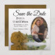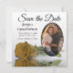 Ces magnifiques cartes de dates sont le moyen parfait pour que vos amis et votre famille connaissent votre prochain mariage. Elles présentent un design élégant avec un seul rose doré long ou jaune moutarde réfléchissant dans un bassin d'eau avec des vagues et ondulant avec votre photo dans un cadre ovale sur un arrière - plan blanc classique. La légende indique Enregistrer la date avec de l'espace pour vos noms, la date et l'emplacement. Le dos est marbré de couleur orange citrouille.