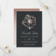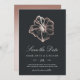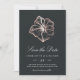 Avertissez les invités de votre prochaine destination, plage, ou mariage d'île tropicale avec ces beaux été enregistrer les cartes de date avec une fausse illustration de fleur d'hibiscus en feuille d'or rose sur un arrière - plan noir riche et doux. Élégant script blanc et écriture bloc affiche les détails de votre mariage (noms, date du mariage, emplacement et site Web).