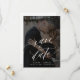 Moderne romantique chic mariage noir moody enregistrer la date modèle avec votre photo personnalisée dans un faux vellum foncé transparent superposition avec blanc classe écriture calligraphie lettrée main. +++++++++++++ Facile à personnaliser avec vos détails et photo fiançailles des deux côtés ! +++++++++++++ Convient pour toute saison de mariage élégant thème.