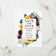 Moderne Elégant Aquarelle Floral Enregistrer La Carte Date comprend des roses bordeaux, des roses roses roses, des fleurs bleues, des fleurs rouges, des tournesols, des feuilles d'eucalyptus et des feuilles de verdure botanique sur un cadre doré. Dos Bleu.
