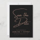 Cette carte Save The Date présente un design minimaliste élégant. La carte noire a un Save The Date dans une typographie d'écriture manuscrite en or rose. Personnalisez avec vos noms, date mariage et emplacement dans une simple police or rose.