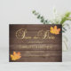 Pour ce thème mariage automne / automne, ces magnifiques cartes de modèle de bois rustique et or SAVE THE DATE sont faciles à éditer. FALL IN LOVE dans la topographie dorée design et or orangé feuille métallique donne à ces cartes une touche d'élégance supplémentaire. Le dos de la carte a faux coeur d'or avec les monogrammes de mariée et mariée. Contactez le concepteur pour plus de variations.