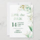 Élégant Enregistrer la carte Date convenant à toute occasion. Le modèle est mis en place pour que vous personnalisiez avec votre date spéciale, votre occasion et votre (vos) nom(s). Ce feuillage raffiné présente une verdure aquarelle, des feuilles dorés et des éclaboussures de parties scintillant dorées. L'option Enregistrer la date est indiquée dans une impression à feuilles tandis que le texte personnalisé est en vert solide, ce qui correspond à l'arrière de la carte. Veuillez naviguer dans mon magasin pour coordonner les invitations.