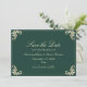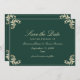 Elégant vert émeraude et or baroque enregistrer la carte de date avec un monogramme royal sur le dos. Parfait pour les mariages classiques et luxueux, ce design met en valeur des détails intemporels et un charme formel. Personnalisez avec les noms, la date et l'emplacement pour créer un faire-part élégant que vos invités aimeront. Idéal pour les fêtes traditionnelles, royales ou d'inspiration vintage. Invitations correspondantes, RSVP, menus, programmes et plus encore disponibles dans la suite mariage complète.