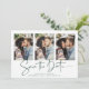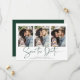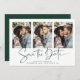 Modern manuscrit Enregistrer la date Carte photo multiple en vert émeraude et blanc dans une police qui est élégant et évoque une sensation manuscrite romantique. Conçu pour utiliser trois de vos photos préférées pour une personnalisation supplémentaire. Ajoutez facilement vos noms et dates pour un design vraiment personnalisé. Veuillez nous contacter à cedarandstring@gmail.com si vous avez besoin d'aide pour la conception ou les produits correspondants.