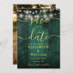 Cette élégante cordes vert émeraude lumières rustique grange bois boho mariage enregistrer la date peut être personnalisée avec vos informations en typographie or chic et photo spéciale au verso. Conçu par Thisisnotme©