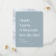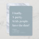 Enfin une partie Texte simple Dusty Blue Minimalist Enregistrer la date. Un design simple et moderne met en évidence cette typographie modifiable en couleur! Enfin. Une fête. Avec les gens. Save the date! Avec une jolie texture de marbre sur le côté arrière, mais peut être remplacé par votre propre photo. ~ Regardez ma boutique pour voir l'ensemble de la suite mariage pour ce design!