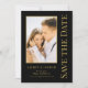 Save The Date Black Gold Stylish Script Modern Wedding Cartes dispose d'un arrière - plan noir avec votre photo personnalisée. Personnalisez avec votre texte en modifiant le texte dans les zones de texte fournies. Conçu pour vous par ©Evco Studio www.zazzle.com/store/evcostudio