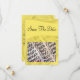 Ce faire-part élégant "Save The Date" avec des éléments correspondants est conçu avec un arrière - plan en spirale jaune cassé et une bannière couleur ondulée sur le devant supérieur. La conception peut servir à n'importe quelle occasion lorsque vous remplissez les champs modèles avec vos détails, supprimer les informations indésirables et/ou cliquez sur le bouton Personnaliser orange! pour sélectionner un style de police, la taille et la couleur que vous préférez sur l'avant et l'arrière. Sur le devant, remplacez la photo modèle par votre photo et c'est fait. Vous trouverez ci-dessous l'enveloppe de la taille A6 dans laquelle le faire-part va s'adapter, un autocollant en forme de coeur correspondant à inclure avec la carte faire-part, un timbre postal pour envoyer cette combinaison sophistiquée et un aimant carré.