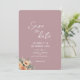 Rose vif "sauvez la date" pour les mariages, avec des fleurs d'abricot aquarelle et le feuillage du jardin. Un design botanique contemporain simple mais élégant, inspiré du style boho vintage, avec monogramme sur le dos.