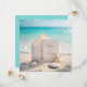 Une carte blanche et une enveloppe reposent sur une plage de sable entourée de coquillages, une étoile de mer, et un arrière-plan d'océan turquoise..