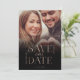 Moderne et minimaliste, carte de sauvegarde de date photo. Le design présente une photo pleine moderne pour afficher votre propre photo spéciale. "Sauvez notre date" est affiché dans un design de typographie de feuille de rose or moderne avec les noms et la nouvelle date de mariage. Le dégradé de photo noir ajoute un look luxueux.