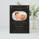 Mystical Black Gold Sun Moon Star Space Save The Dates présente un cadre de soleil, de lune et d'étoiles en or sur un arrière - plan noir. A l'intérieur est votre photo préférée et votre personnalisation enregistrer les informations de date. Personnalisez en modifiant le texte dans les zones de texte. Conçu pour vous par ©2022 Evco Studio www.zazzle.com/store/evcostudio
