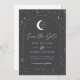 Une carte de sauvegarde de date avec un thème de lune et d'étoiles célestes avec un fond gris charbon et un texte blanc avec des éléments. Personnalisez la couleur du motif d'étoiles, du fond, du remplissage de l'arche et de l'élément de lune !