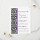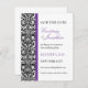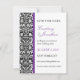 Un papier peint damassé noir et blanc ainsi que des accents de pourpre royal servent à mettre en valeur cette invitation. Personnalisable facilement avec votre/vos nom(s), date et informations de l'événement. Le verso est intentionnellement laissé vierge. Disponible en couleurs alternatives avec des faveurs, des cartes postales et des invitations assorties