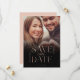 Carte moderne et minimaliste d'annonce de date de mariage avec photo. Le design présente une photo pleine page moderne pour afficher votre propre photo spéciale. "Événement à Sauvegarder" est affiché dans une typographie moderne en faux rose doré avec les noms et la nouvelle date de mariage. Le dégradé noir sur la photo ajoute une touche de luxe.
