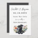 Faire part de mariage pour réserver la date avec un design de chien Schnauzer. Un chien noir est allongé parmi les fleurs sauvages au bas d'un papier blanc. Tout le texte est noir et gris foncé et le dos de la carte est gris uni. Modifiez facilement les polices et les couleurs à l'aide de l'outil de conception. Cette taille plus petite peut également être convertie en taille 5x7. Vous pouvez également choisir de partager vos annonces en ligne en utilisant l'option de téléchargement instantané.
