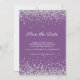 Élégante carte de faire-part de mariage violet avec paillettes argentées. Personnalisé avec les noms des mariés et leur date et lieu de mariage prévus.