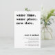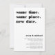 Besoin de reporter ou de reprogrammer votre mariage ? Informez vos invités avec ces cartes modernes et légères en blanc avec lettrage noir. Un design humoristique et astucieux basé sur la typographie présente "même heure, même lieu, nouvelle date" en haut avec votre nouvelle date de mariage et les détails en dessous.