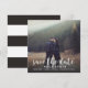 Annonce de mise en attente fantaisiste et élégante avec photo mettant en vedette une écriture calligraphique moderne blanche et un fond à motifs rayés