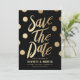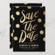 Annoncez votre date de mariage avec ce personnalisable enregistrer l'annonce de date. Il présente des points confettis en feuille d'or et typographie moderne sur arrière - plan arrière. Personnalisez cette fausse feuille d'or enregistrer la carte de date en ajoutant des noms, la date, le lieu et d'autres détails. Ce noir et or enregistrer la carte date est parfait pour les mariages modernes.