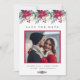 Un cadre rouge entoure votre photo fiançailles. Trois grandes fleurs de poinsettia rouges nichées dans la verdure hivernale forment une bordure fleurie de style ferme. Le même motif floral forme un plus petit posey au bas de la carte de date. Vos noms, date mariage et emplacement sont écrits dans un texte gris clair. L'arrière - plan plaid rouge au dos de l'invitation enregistrer la date continue le style de design de la ferme.