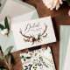 Feuillage rustique, fleurs et bois de cerf détails mariages carte d'enclusure. Avec un beau feuillage aquarelle, des fleurs blanches, une tranche de bois et une écriture manuscrite. Cet invitation moderne est sûr de définir le style de votre prochaine fête.