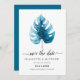 Conception moderne de carte de sauvegarde de date de mariage avec illustration de feuille de monstera aquarelle sur un fond blanc simple. Le verso de l'invitation est de couleur bleu foncé.