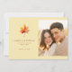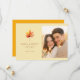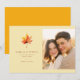 Cette carte de save the date de mariage présente une mise en page divisée avec une illustration artistique de feuille d'érable à gauche, rendue dans des tons chauds d'automne rouge, orange et jaune. Le côté droit présente un espace réservé pour une photo de couple, sur un fond beige clair qui complète la palette de couleurs douces de jaunes et de crèmes. Le design allie minimalisme moderne et charme rustique, en utilisant des polices sérif élégantes pour afficher des détails personnalisables comme les noms et les dates. Son ambiance cosy et intime en fait un choix parfait pour célébrer l'amour et l'engagement.