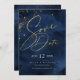 Un arrière - plan d'aquarelle dans les tons du bleu royal à la marine est surmonté d'une abstraite de lignes dorées fines et d'effets lumineux scintillants pour créer les pièces de cette belle suite mariage. La carte "Enregistrer la date" mariage présentée ici présente également du texte bas centré et une calligraphie élégante. Ajoutez facilement vos propres noms, date mariage et informations en utilisant le modèle fourni. Recherchez ID867 pour voir d'autres pièces et choix de couleurs pour cet ensemble.
