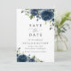 Invitations amis et famille dans le style et donner le ton pour votre journée spéciale avec ce charmant enregistrer la carte de date. Le design présente des fleurs d'aquarelle bleu marine et de la verdure sur l'arrière - plan blanc.