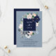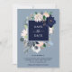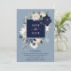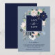 Cette carte de sauvegarde de mariage élégante présente un cadre de fleurs aquarelles bleu marine, bleu clair et rose blush avec des feuilles vertes et beige neutre. Le dos de la carte est bleu marine foncé.