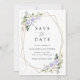 Invitations amis et famille dans le style et donner le ton pour votre journée spéciale avec ce charmant enregistrer la carte de date. Le design présente des fleurs d'aquarelle violette et blanche, de la verdure, des confettis dorés et un cadre doré sur un arrière - plan blanc.