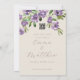 Cette suite de papeterie mariage présente un superbe aquarelle peint à la main de fleurs violettes et de feuilles verts, créant une esthétique élégante et romantique. Les fleurs sont finement confectionnées avec des touches délicates, tandis que les feuilles verts ajoutent profondeur et équilibre à l'ensemble du design. La suite est imprimée sur un doux arrière - plan beige, ce qui crée une atmosphère chaleureuse et accueillante pour les clients. Le script et les polices serif utilisées pour le texte sont soigneusement sélectionnés pour compléter le design floral, ajoutant à l'attrait esthétique général de la suite.