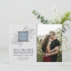 Cette date de sauvegarde présente charme et simplicité, avec les noms de mariée et de mariée centrés sur un lit de feuillage délicat, et une photo de la mariée et du marié. Changez la couleur du carré au milieu pour choisir la couleur de votre mariage ! Veuillez nous contacter si vous souhaitez customiser cette invitation.