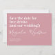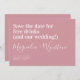 Faites savoir à vos amis et à votre famille que vous avez fixé un rendez-vous avec cette drôle de carte de datation - le texte dit : "Sauvez la date pour des boissons gratuites (et notre mariage !)"
