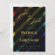Announce your wedding day in style with this gay men wedding save the date card — bold diagonal Progress Pride stripes on sophisticated black with "Save the Date" in flowing gold script, the grooms' full names, wedding date, and "Formal invitations to follow" in gold typography. The first piece your guests will receive from the Gay Men Wedding Elegant Rainbow collection — a complete suite of coordinating stationery and accessories designed for two grooms, available in this store.