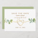 This elegant greenery wedding save the date card features a clean minimalist design with soft eucalyptus greenery accents and a delicate gold rope heart, creating a timeless and romantic announcement for your wedding day.